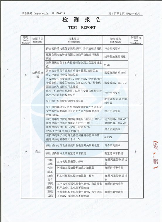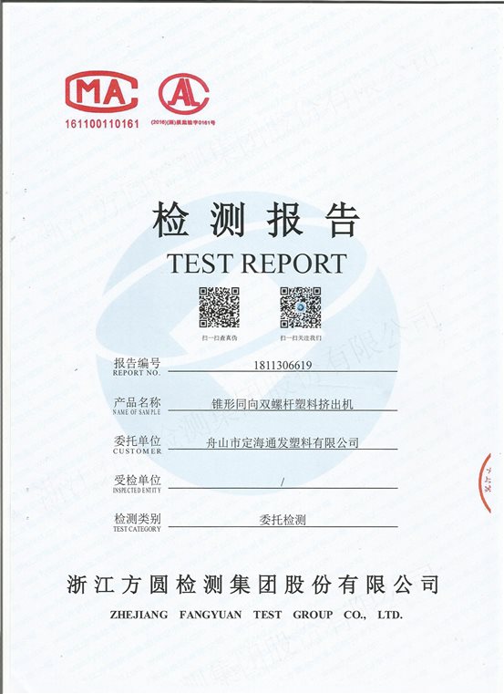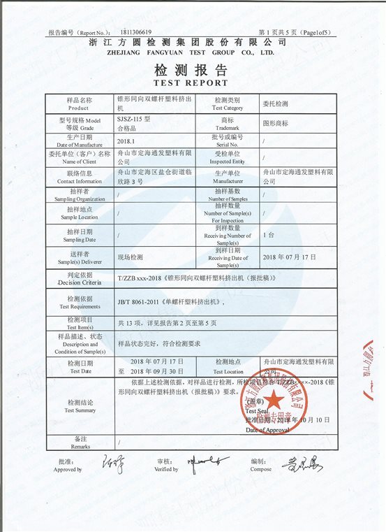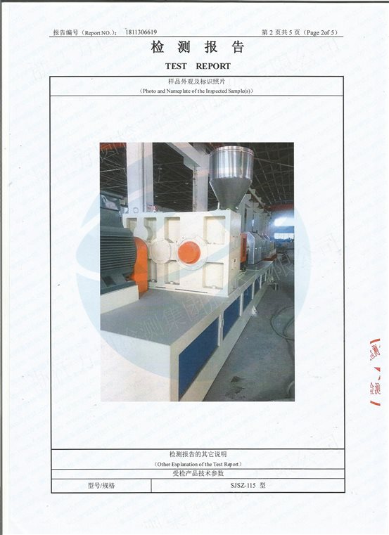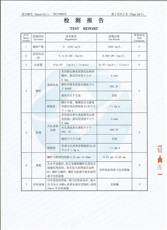 近期,我公司自主研制的SJSZ115型锥形同向双螺杆挤出机试机成功,样机通过浙江方圆检测集团权威检测,经检测,每小时产量可达2469公斤,实际比功率0.098!具体检测报告如下: